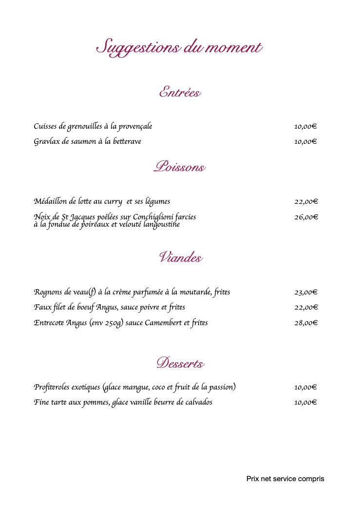 Notre restaurant propose une cuisine traditionnelle de qualité élaborée à partir de produits frais et locaux.